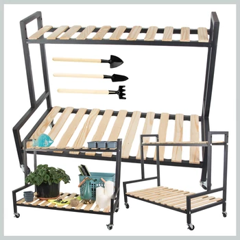 Etajeră mobilă pentru flori, 2 niveluri, cadru metalic și rafturi din lemn – 27398_CZ