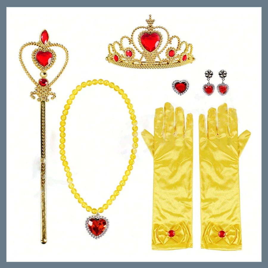 Acest set spectaculos de accesorii aurii pentru prințesă este alegerea ideală pentru orice fetiță care adoră să se costumeze și să se lase purtată de imaginație. Bijuteriile și accesoriile detaliate, cu inimioare roșii, sunt perfecte pentru carnavaluri, jocuri de rol sau petreceri aniversare.